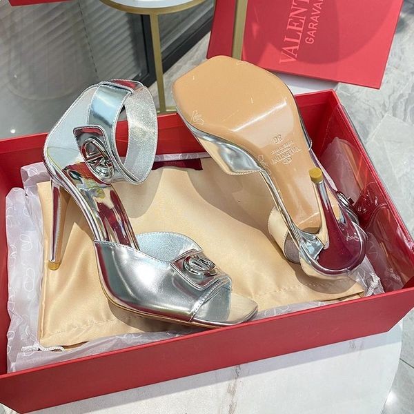 فالنتينو Vlogo الرومانية مشبك الصنادل المرأة جلد العجل فضية