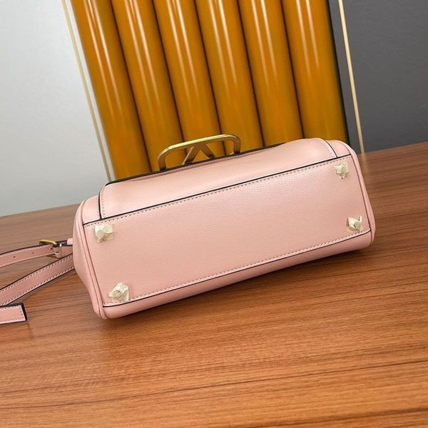 Valentino Medium Rockstud Handbag In Grainy Calfskin Pink-Pink Valentino Rockstud Alcove Handbag.-Grainy Calfskin.-Antique brass finish hardware, Iconic VLogo Signature coveRedwith studs.-Double handles, adjustable and removable shoulder strap.-Double twist-lock closure.-Front pocket with magnetic closure.-Interior rear compartment with zipper pocket and front compartment with flap pocket.-Size: W23 * H20 * D6 cm.