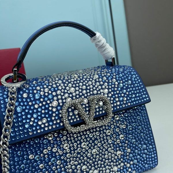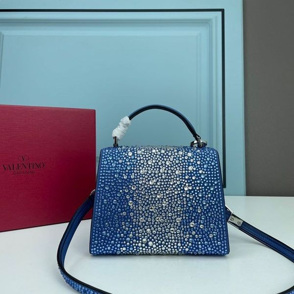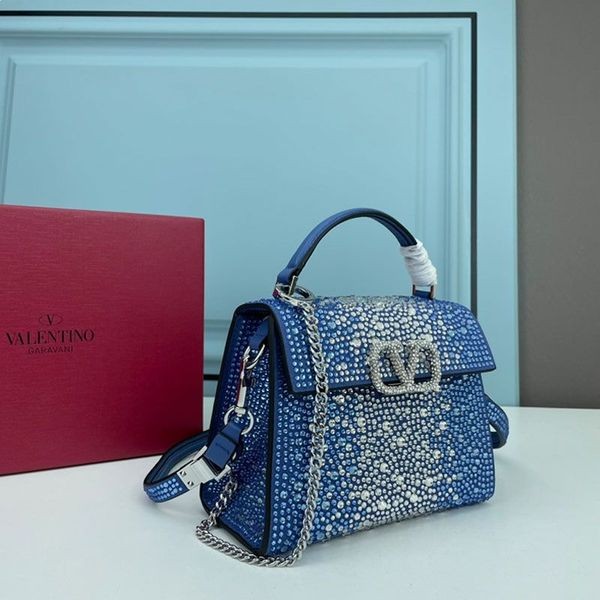 Valentino Mini Vsling Handbag with Sparkling Crystals In Calfskin Blue/White-Blue/White Valentino Vsling Handbag.-Calfskin with Sparkling Crystals Embroidery.-Hardware with an silver hardware finish.-Entirely coveRedin Crystals with VLogo Signature closure.-Leather shoulder strap with adjustable chain.-Magnetic closure.-Protective feet.-Nappa lining. Interior: open slip pocket.-Size: W19 * H13 * D9 cm.