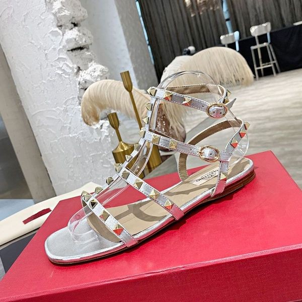 Valentino Rockstud Flat Sandals With Ankle Strap Women Calfskin Silver