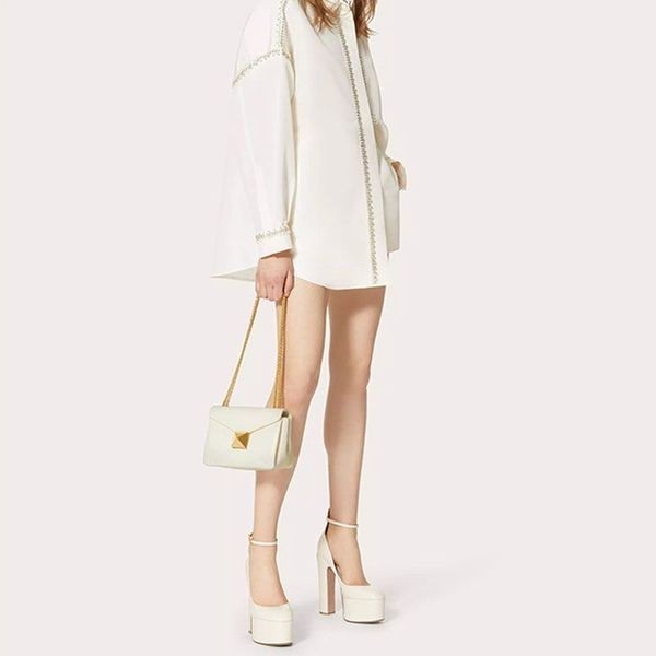 Valentino Small One Stud Shoulder Bag with Chain In Grainy Calfskin White-White Valentino One Stud Shoulder Bag.-Grainy Calfskin.-Antique Brass finish on stud and metal parts.-Magnetic closure.-Nappa Lining. Interior: one flat pocket.-Size: 19 * 14 * 11 cm.