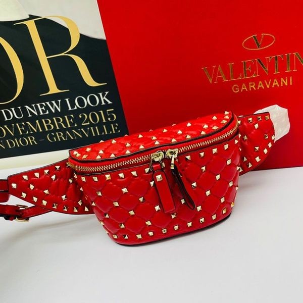 Valentino Small Rockstud Spike Belt Bag In Lambskin Red-Red Valentino Rockstud Spike Belt Bag.-Quilted lambskin.-Rhombus pattern enhanced by stitching.-Platinum-finish studs and hardware.-Adjustable waist belt.-Zip fastening.-Interior flat pocket.-Size: W19 * H10.7 * D5 cm.