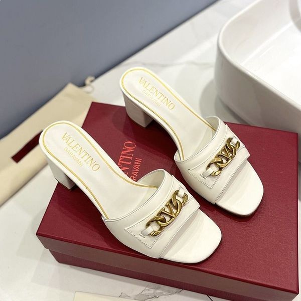 Valentino VLogo Cadena Gruesa Tacón Diapositivas De Las Mujeres De Piel De Becerro Blanco