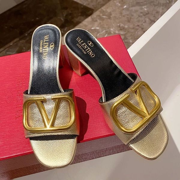 Valentino VLogo Firma Gruesa Tacón Diapositivas De Las Mujeres De Piel De Becerro Granulada De Oro