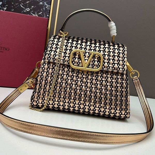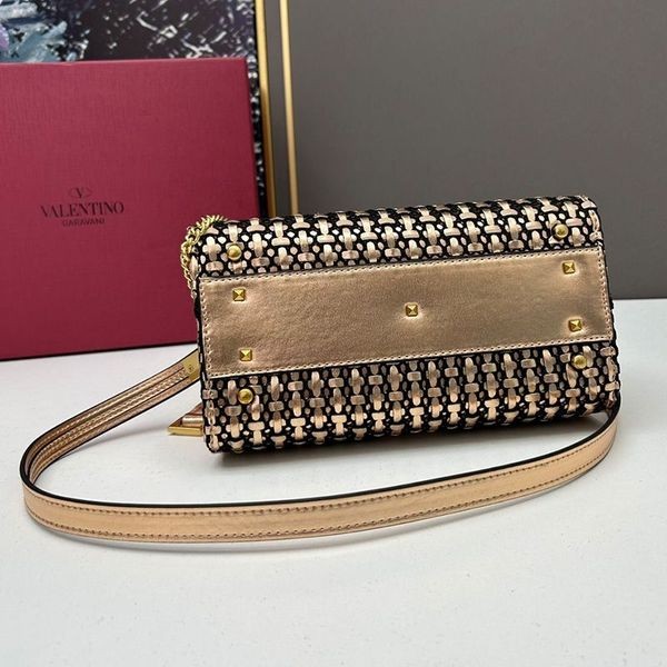 Valentino Petit Vsling Sac À Main En Tissu Rayé Avec Du Veau D'Or/Noir-Or/Noir Valentino Vsling Sac À Main.-Galon Tissé et cuir de Veau.-Antique en laiton-finition de matériel en métal.-Poignée supérieure, bandoulière avec chaîne réglable.-Fermeture magnétique et logo en cuir.-Intérieur: poche zippée.-Taille: W22 * H16 * D9 cm.