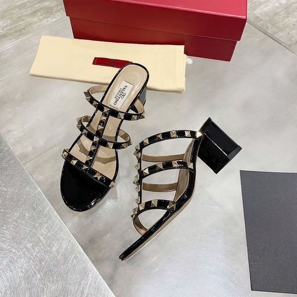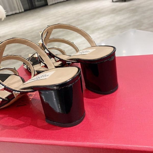 Valentino Rockstud Thick-Heeled Slides Women Patent Leather Black-Black Valentino Rockstud Slides.-Patent Leather. -Straps embellished with studs.-Heel Height: 6 cm.-Women Size: EU 35, EU 36, EU 37, EU 38, EU 39, EU 40, EU 41.