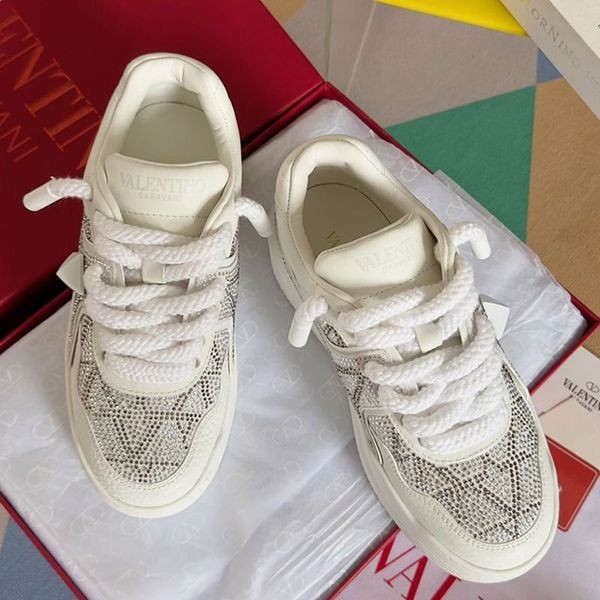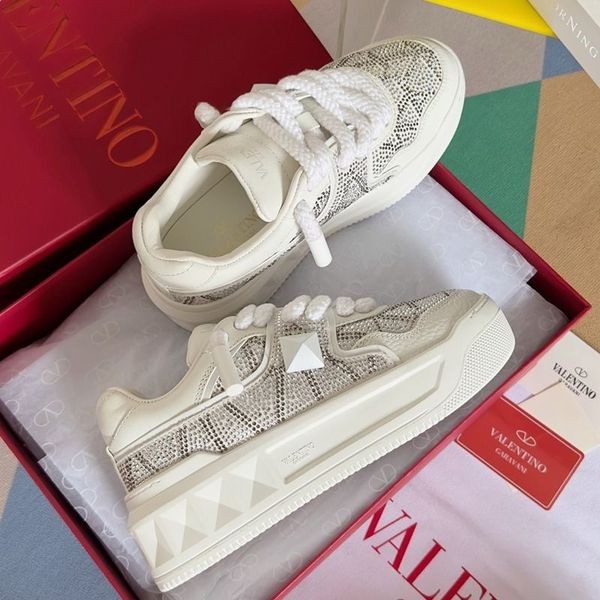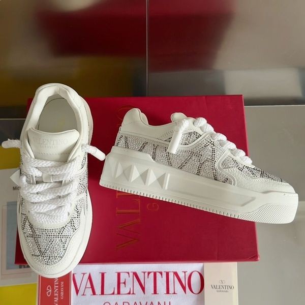 - Valentino Un Goujon XL Low-Top Sneakers Unisexe en Cuir Nappa Avec Toile Iconographe Cristaux Blanc