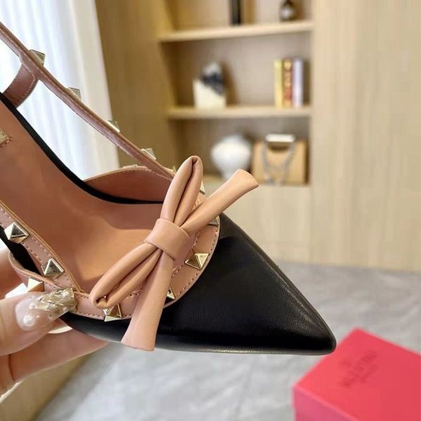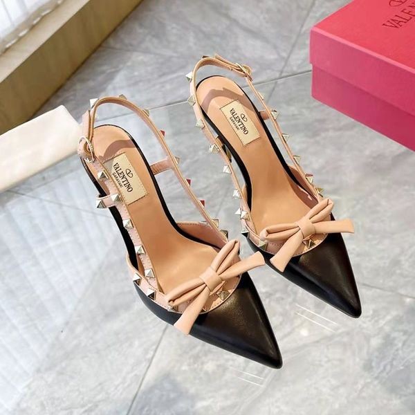 Valentino Rockstud Bow Slingback Caidéil Mná Calfskin Dubh/Biotáille Aibreog