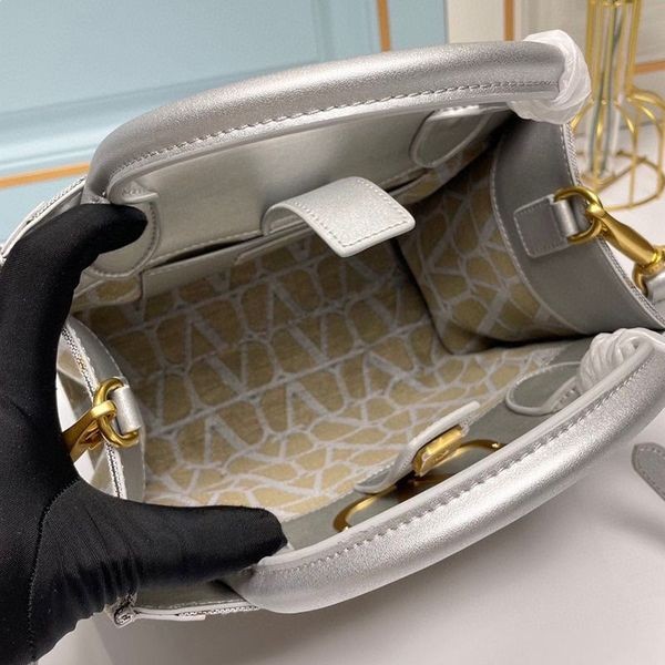 Mali shopping bag Valentino iz tkiva Toile Iconographe srebrne boje/hack-Shopping bag Valentino srebrne boje/kaki.-Tkanina Toile Iconographe.-Odvojivi remen.-Magnetna kopča.-Zaštitne noge.-Iznutra: jedan našiven džep.-Veličina: Ш28 * В18 * Г11 vidi