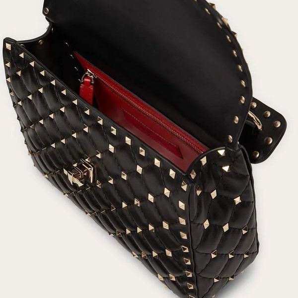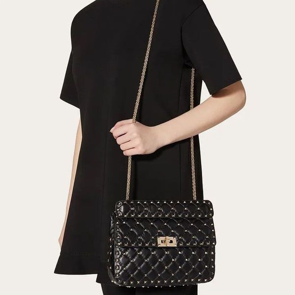 Valentino Közepes Rockstud Spike Lánc Táska Báránybőr Fekete/Arany