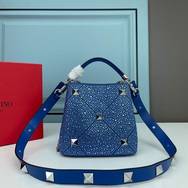 Valentino Mini Római Stud Kézitáska Csillogó Kristályok Nappa Bőr, Kék-Kék Valentino Római Stud Kézitáska.-Nappa Bőr.-Steppelt építési díszített maxi szegecsekkel.-Felszerelt mind egy levehető csúszó szíj, lánc, valamint levehető bőr szíj.-Hang-on-hang befejezni, csapok, hardver.-Elülső zseb, csavar-zár bezárása.-Hátsó rekesz mágneses bezárása.-Védő lába.-Nappa bélés. Belső: egy kártya nyílásba.-Méret: W20. * H15* D9 cm.