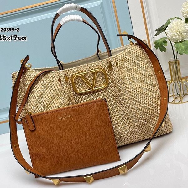 Valentino Medio VLogo Firma Shopping Bag Con Romano Borchie In Sintetico Riffia Beige