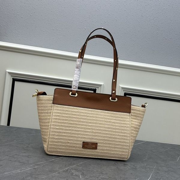 Valentino Piccolo Tote Rockstud In Riffia Beige-Beige Valentino Rockstud Borsa.-Riffia.-Oro-finitura borchie e hardware.-Tracolla staccabile.-Gancio di chiusura.-Interna piatta tasca con zip.-Dimensioni: W26 * H21 * D10 cm.