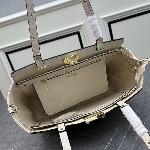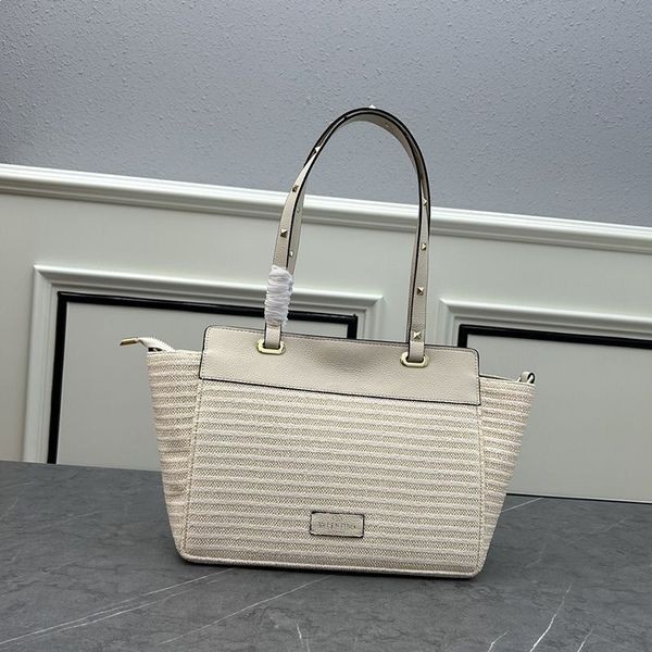 Valentino Piccolo Tote Rockstud In Riffia Bianco-Bianco Valentino Rockstud Borsa.-Riffia.-Oro-finitura borchie e hardware.-Tracolla staccabile.-Gancio di chiusura.-Interna piatta tasca con zip.-Dimensioni: W26 * H21 * D10 cm.