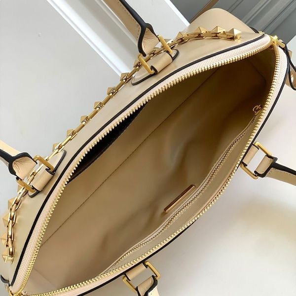 Rockstud Valentino E/W Duffle Bag In Kalfsleer Khaki-Khaki Rockstud Valentino Duffle Bag.-Kalfsleer.-Gouden studs en hardware.-Dubbele Handvatten, Ketting schouderriem met centrale haakjessluiting.-Rits sluiting.-Interieur: slip pocket.-Maat: W34 x H11 x D8 cm.