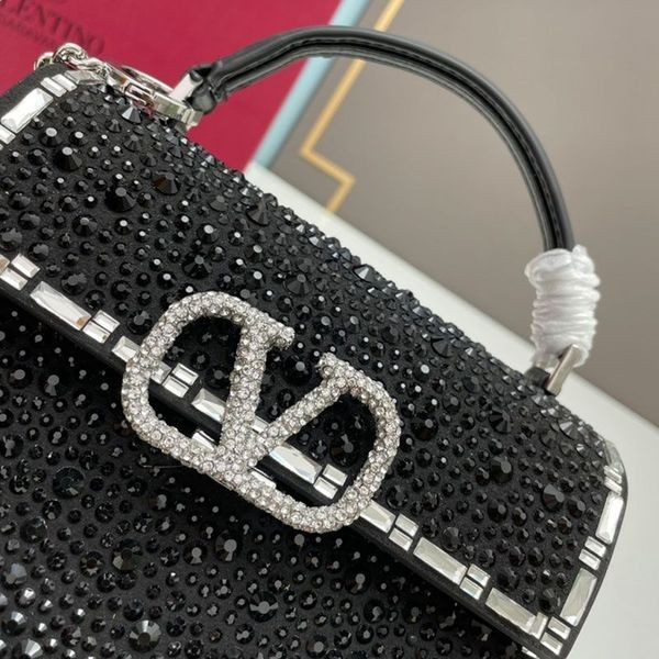 Valentino Mini Vsling Veske med Skinnende Nagler og Jewel Broderi I Semsket skinn Sort / Sort Valentino Vsling Veske.-Semsket skinn med Glitrende Stendere og Krystaller og Jewel Broderi.-Palladium-ferdig logo og maskinvare.-Magnetisk lukking.-Skinn skulderveske med regulerbar kjede.-Beskyttende føtter.-Interiør: flat åpne lommen.-Størrelse: W19 * H13 * D9 cm.
