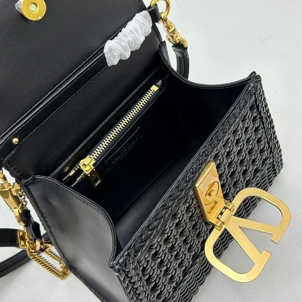 Mała torebka Valentino Vsling z dzianin skóry cielęcej w kolorze czarnym -czarna torebka Valentino Vsling.-Tkane skóra bydlęca.-Metalowe okucia zabytkowe z mosiądzu wykończenia.-Górny uchwyt, pasek na ramię z regulacją łańcuchem.-Magnetyczne zapięcie z skórzanym paskiem.-Wewnętrzne przegródki: kieszeń zapinana na zamek.-Rozmiar: W22 * H16 * D9 patrz