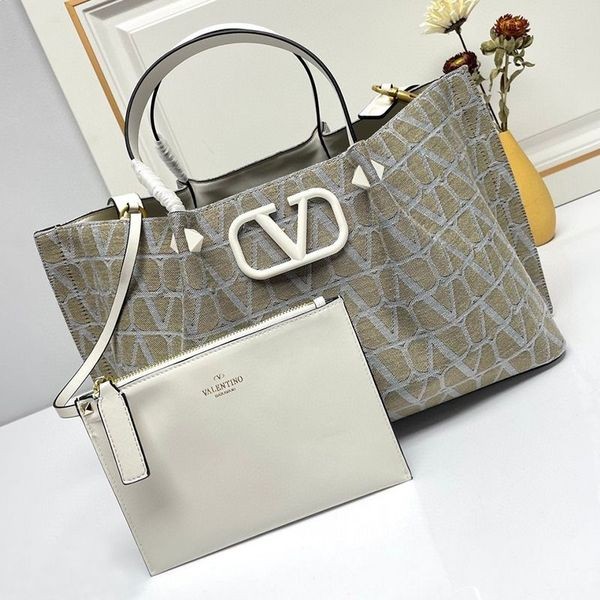 Valentino Medium VLogo Signatur Shopping Väska Med Nitar I Toile Iconographe Tyg Grå