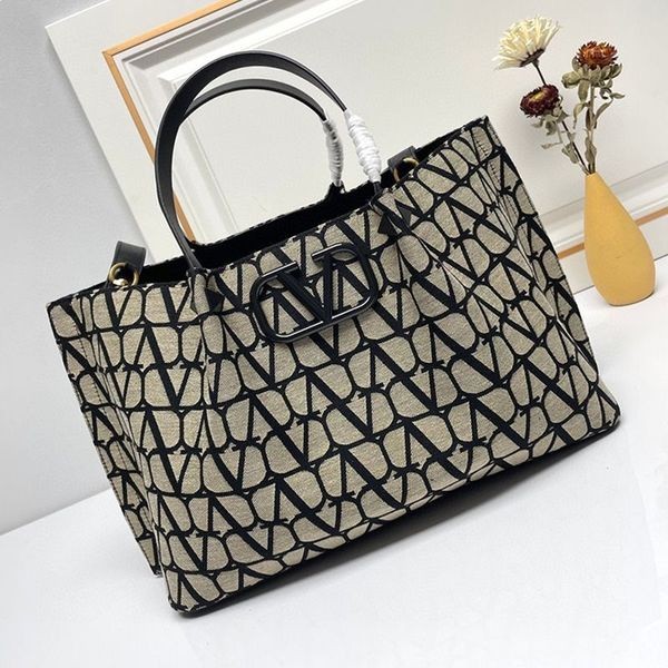 Valentino Medium VLogo Signatur Shopping Väska Med Nitar I Toile Iconographe Tyg Svart