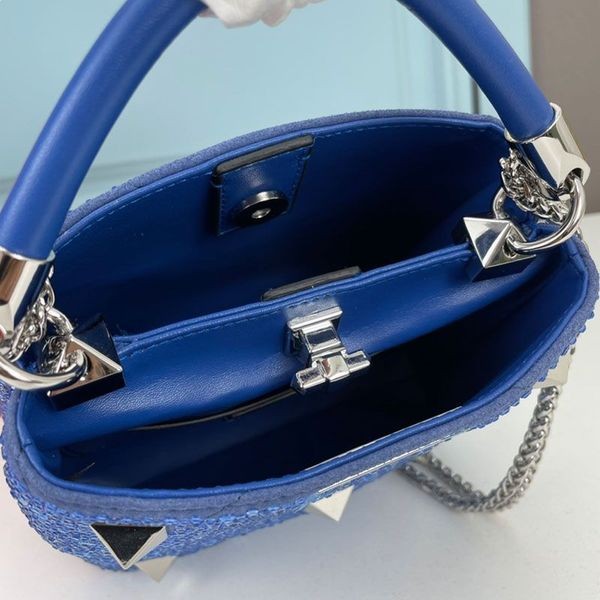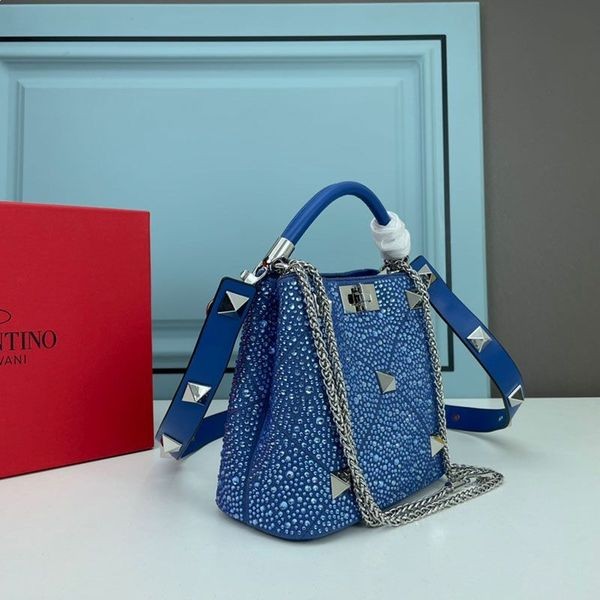 Valentino Mini Romerska Stud Handväska med Gnistrande Kristaller I nappaläder Blå-Blå Valentino Romerska Stud Handväska.-Nappa Läder.-Quiltad konstruktion och prydd med maxi dubbar.-Utrustad med både en avtagbar glidande kedja rem och en avtagbar läderrem.-Ton-i-ton finish dubbar och hårdvara.-Frontficka med twist-lock stängning.-Bakre fack med magnetlås.-Skyddande fötter.-Nappa foder. Interiör: en kortplats.-Storlek: W20 * H15* D9 cm.