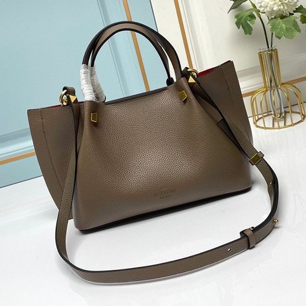 Valentino Små VLogo Fly Tote I Kornat Kalvskinn Kaffe-Te-Valentino VLogo Fly Tote.-Kornat Kalvskinn.-Logotyp och metalldelar antik mässing finish.-Dubbla handtag, avtagbar och justerbar axelrem.-Spänne i metall med logo.-Storlek: W31 * H25 * D15 cm.