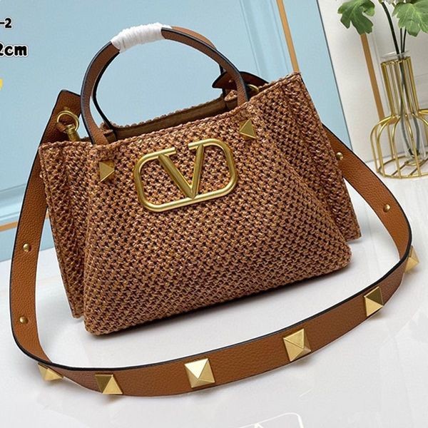 Valentino Små VLogo Signatur Shopping Bag med Romerska Dubbar I Syntetiska Riffia brun-Brun Valentino VLogo Signatur Shopping Bag.-Syntetiska Riffia.-Dubbar och metalldelar i antik mässing finish.-Avtagbar läder axelrem.-Skyddande fötter.-Interiör: öppen ficka.-Storlek: W25 * H18 * D12 cm.