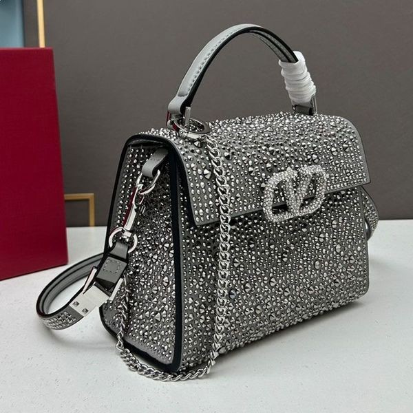 Süet Grisi Işıltılı Çıtçıtlı ve Kristalli Valentino Mini Vsling El Çantası