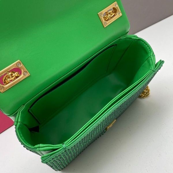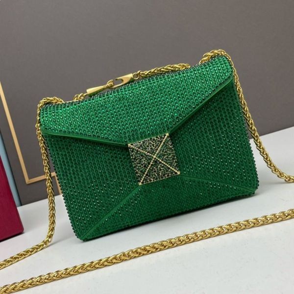 Valentino Süet Yeşili Zincirli ve Işıltılı Kristalli Küçük Tek Taşlı Çapraz Askılı Çanta